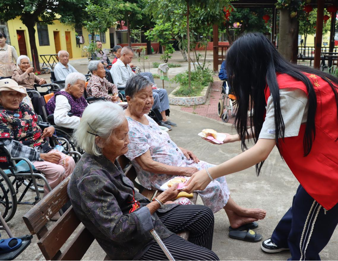 志愿者为老人分发蛋糕