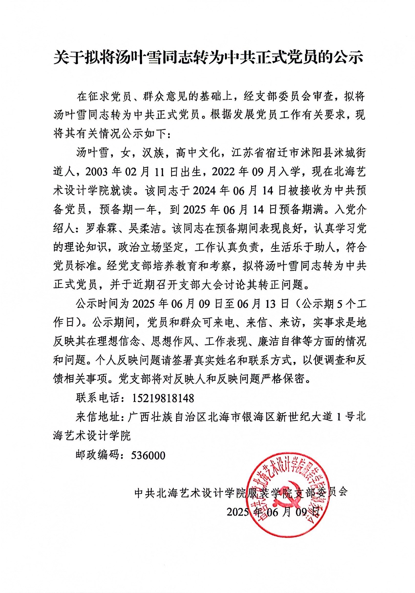 关于拟将汤叶雪同志转为中共正式党员的公示