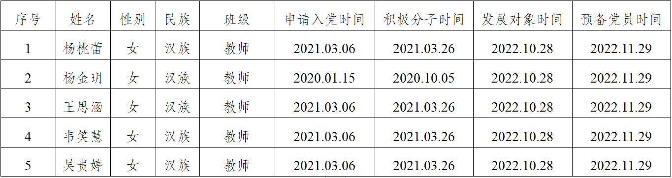 在征求党小组和党员、群众意见的基础上,经支部委员会审查,拟将杨桃蕾等5位同志转为中共正式党员。根据发展党员工作有关要求,现将其有关情况公示如下,同志在预备期间表现良好。经党支部培养教育和考察,拟将杨桃蕾等5位同志转为中共正式党员,并于近期召开支部大会讨论其转正问题。