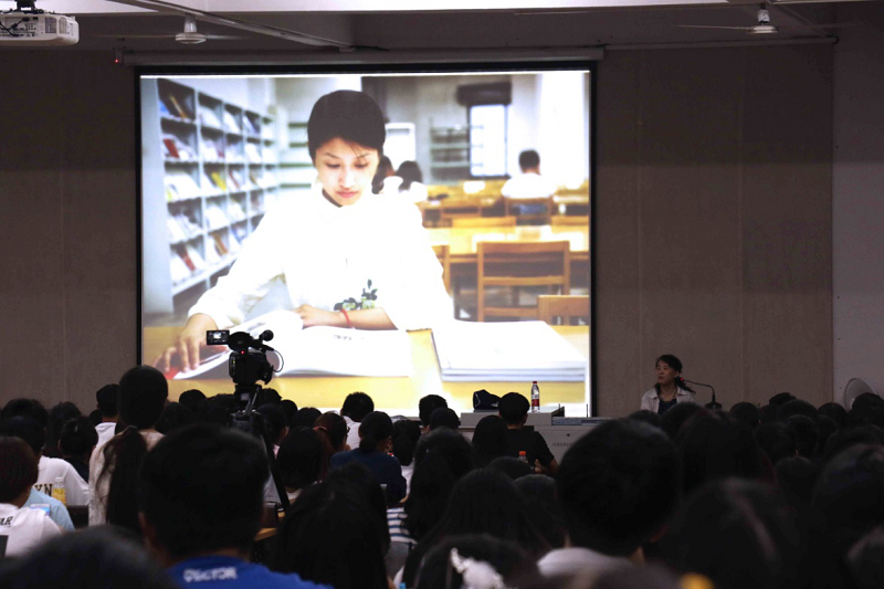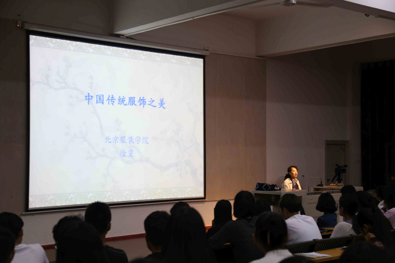 讲座开始,徐教授亮出国际货币基金组织总裁拉加德身穿旗袍的图片,她指出不仅人民币被国际社会认可,中国的传统服饰也将被世界所认可,以小见大引出中国服饰之美,引起了现场同学们浓烈的听讲兴趣。