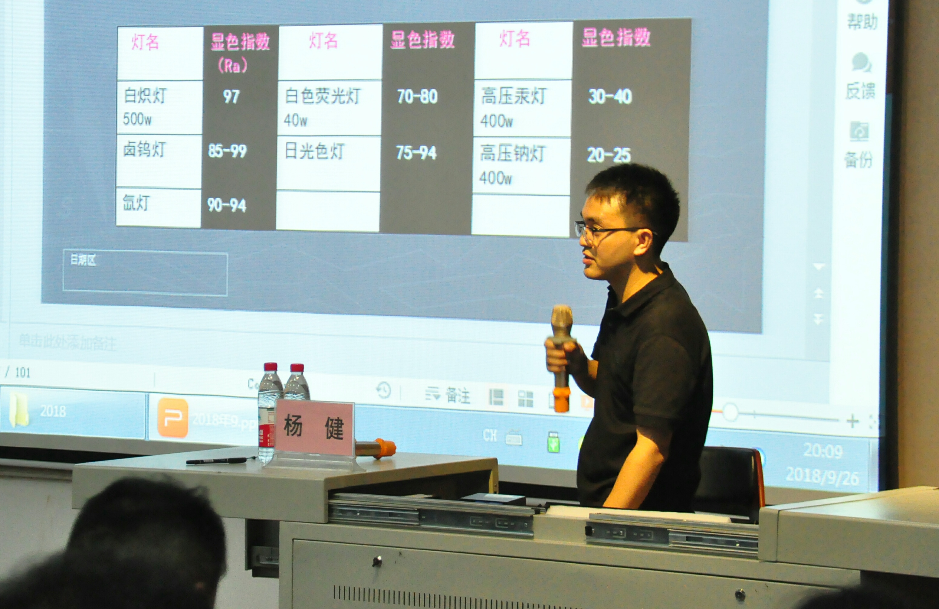 杨健老师讲述了他学习时的个人经历,他表示学习专业知识,要对学习有积极的态度,要熟悉和认知本专业的设计基础知识,明确设计领域的目标,最后要做到融会贯通。杨健老师用酒窖灯光举例,分析了显色指数的概念知识,而对于灯光的规划要从房屋高度、灯具的设计、材料选用以及灯光的搭配等等进行策划,经过多层次的分析实践才能得出设计的方案。