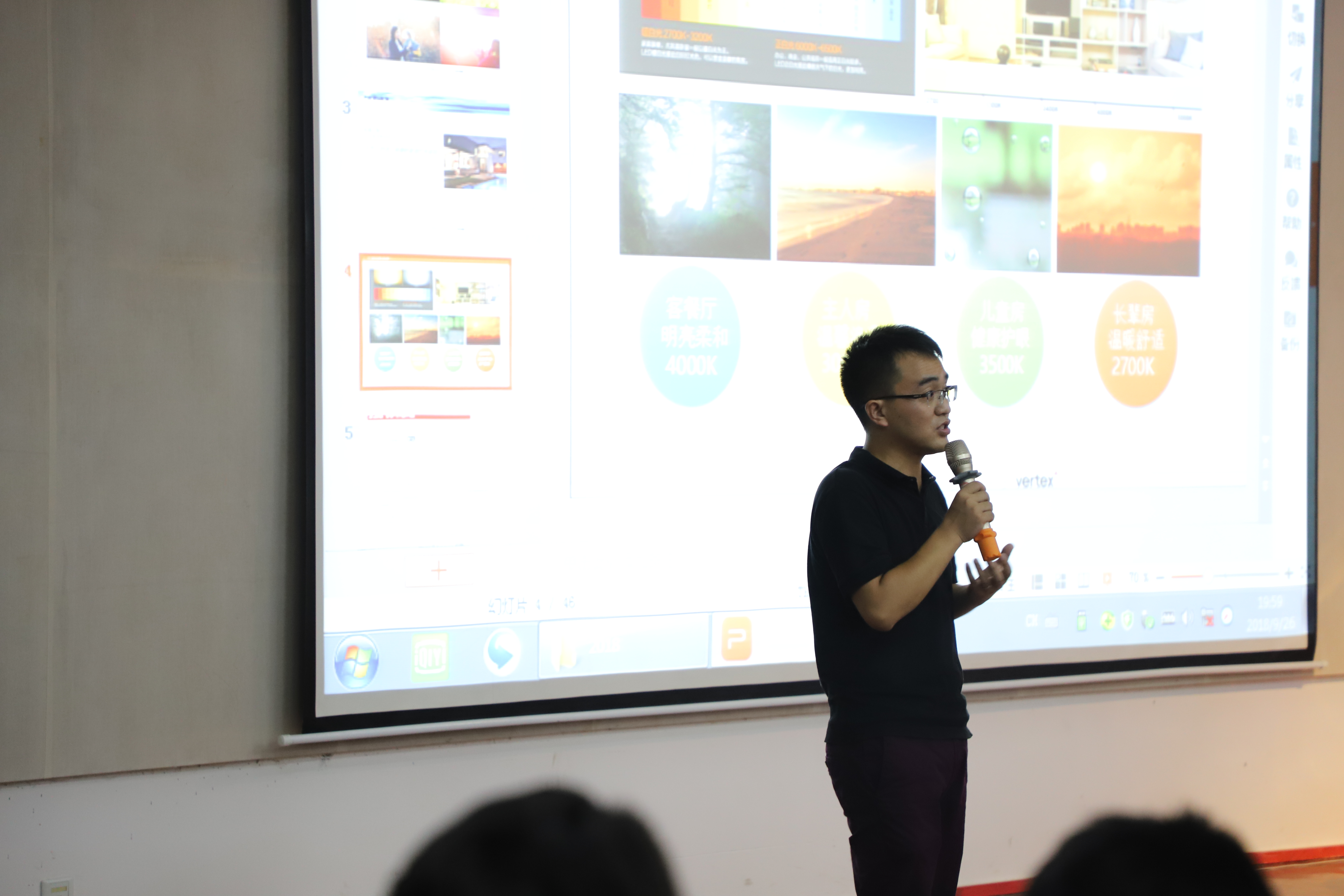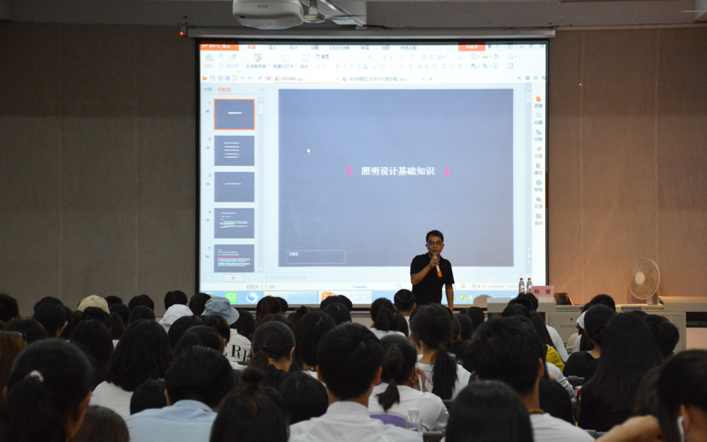 讲座开始,杨健老师讲述了他大学到创业的经历、面对社会、生活的考验和挫折,并分享了他创业实践时的方法和经验。随后,杨健老师分享了关于灯光设计专业领域的知识,引起现场师生浓烈的听讲兴趣。