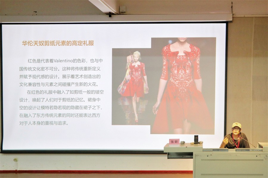 在产品设计的讲授中,张昕教授通过列举大量的国际一流品牌在中国传统文化中寻找灵感的例子,如华伦天奴剪纸元素的高定礼服、芬迪的logo、爱马仕皮革的剪纸元素等,说明中国传统文化在迭代衍生中不断焕发新的顽强生命力,中国传统设计元素是东方文化的一处独特景观和宝贵财富,正在世界艺术发展上熠熠生辉。