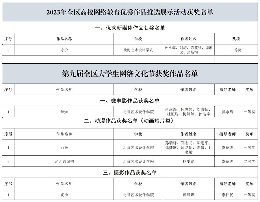 近日,根据自治区教育厅下发的《自治区教育厅自治区党委网信办关于公布第九届全区大学生网络文化节和2023年全区高校网络教育优秀作品推选展示活动获奖名单的通知》,我校共有5项作品获奖,其中一等奖3项、二等奖2项。
