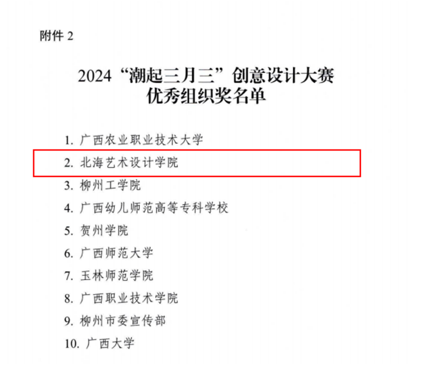 近日,由自治区党委宣传部、自治区教育厅、自治区文化和旅游厅联合举办的2024“潮起三月三”创意设计大赛公布了获奖名单,我校报送的《华彩丝路》《三乐谣音乐节》《北海老街系列牙签盒》3项作品荣获评委会提名奖,学校荣获优秀组织奖。