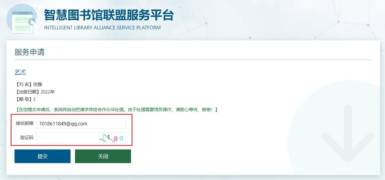 标有“文献传递”标识的文献,点击后进入传递界面,只需在申请界面输入邮箱以及验证码,点击提交后等待片刻即可收到所需文献,可以进入邮箱下载,也可进入右上方我的文献申请里查看。