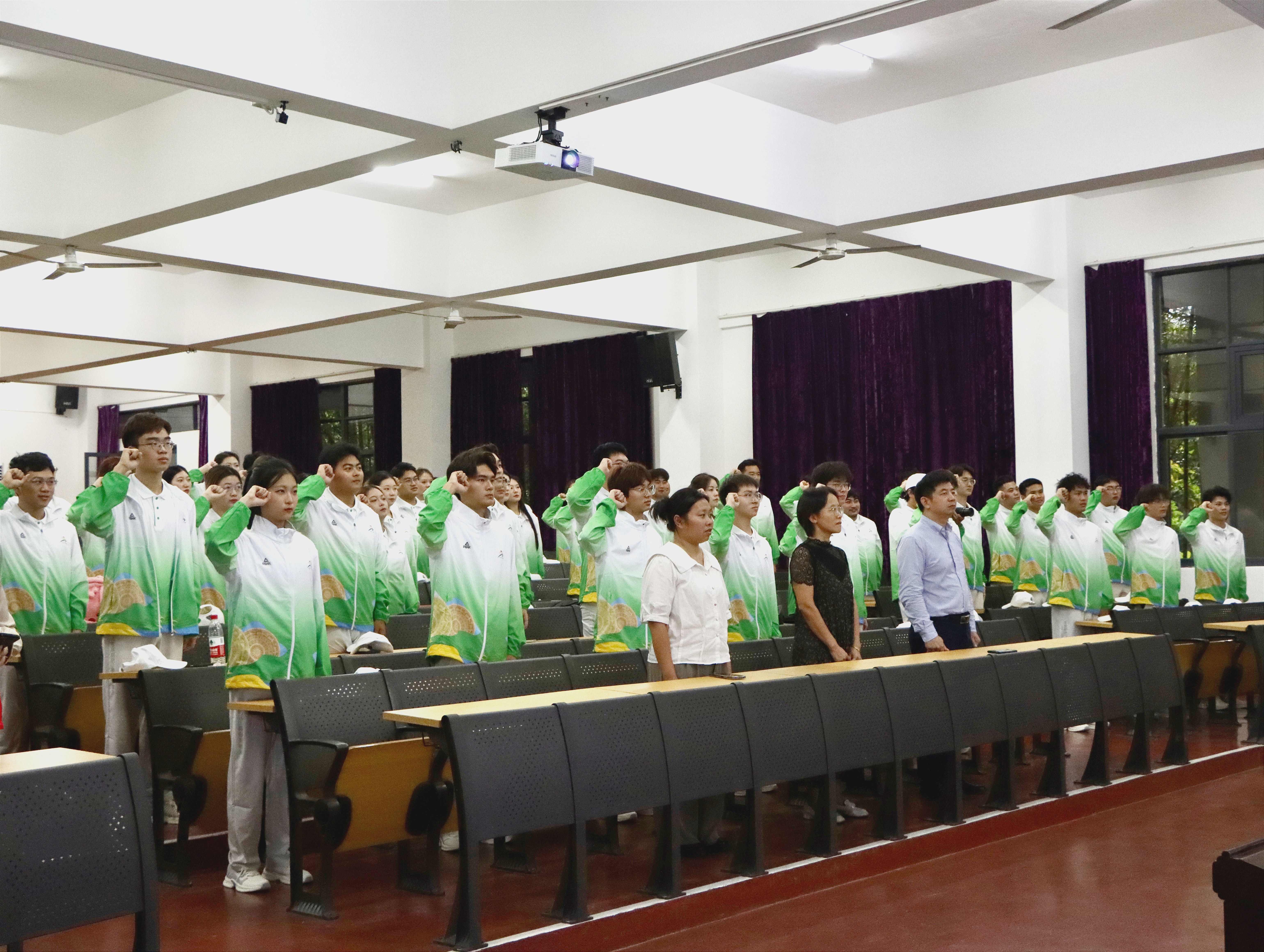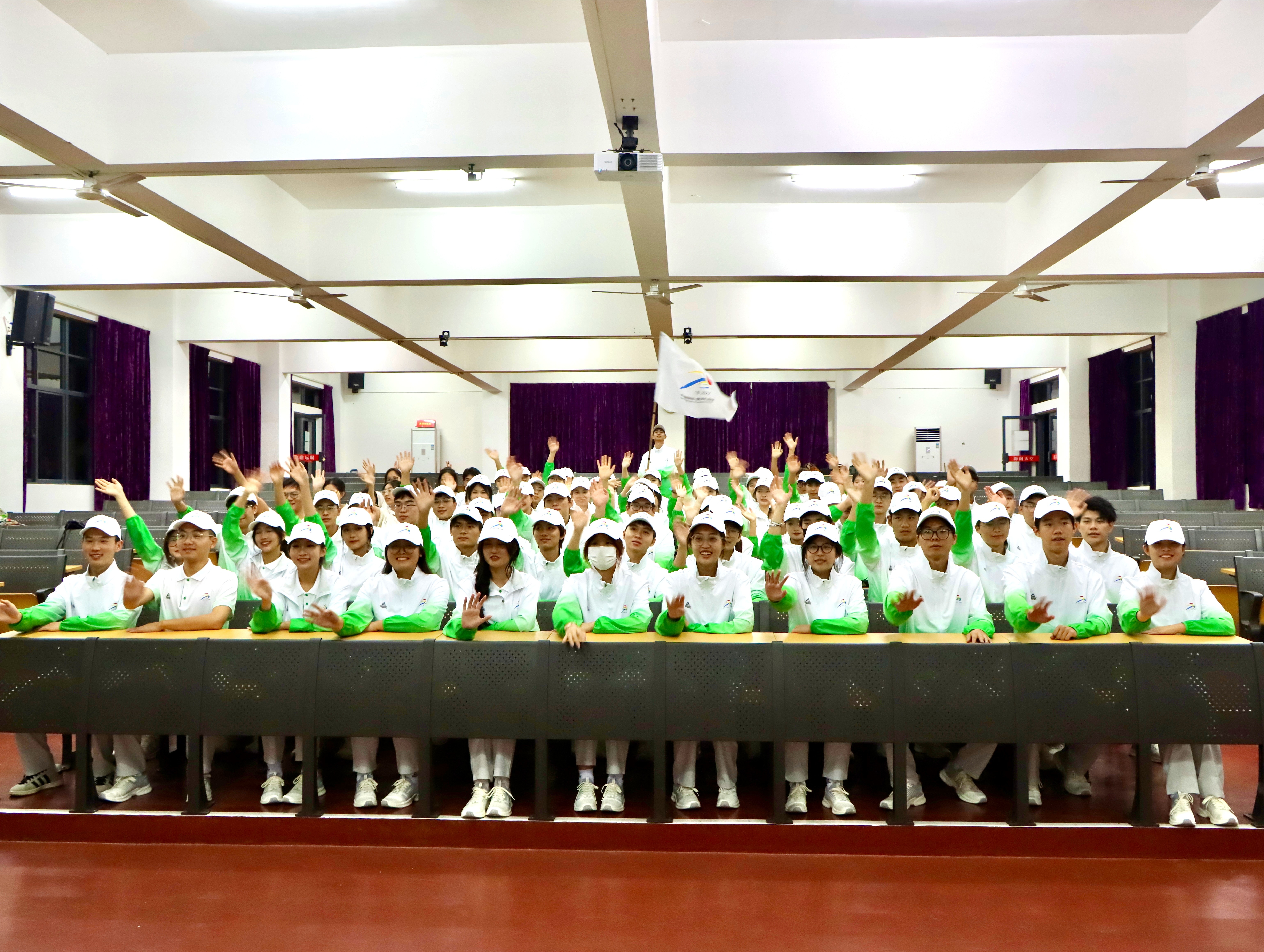 全体志愿者起立奏唱国歌,并集体观看学青会宣传片。