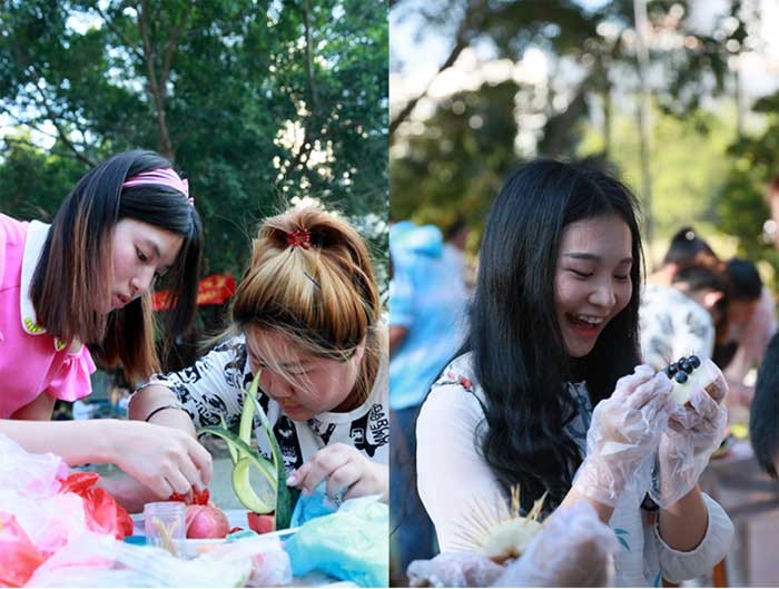 在正值天气炎热的下午,比赛如火如荼的展开。同学们热情高涨活力无限,活动有40组队伍分两轮进行,每轮时间均为30分钟,每轮比赛结束后评委随即现场评分。本次活动同学们充分发挥了自己的想象力和创造力,各种创意和妙想层出不穷,各小组认真实践自己的创意,高质量地完成水果的切拼、造型及水果拼盘主题设计制作,其中有不少作品令人惊喜赞叹。