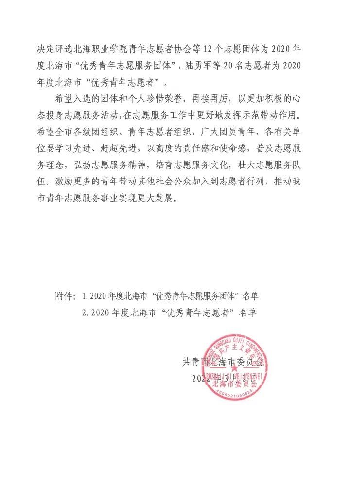 为发挥先进典型的示范引领作用,激励广大青年弘扬“奉献、友爱、互助、进步”的志愿服务精神,积极营造支持、参与、热爱志愿服务的社会文化氛围,共青团北海市委员会决定评选北海艺术设计学院青年志愿者协会等12个志愿团体为2020年度北海市“优秀青年志愿服务团体”,沈星宇等20名志愿者为2020年度北海市“优秀青年志愿者”。