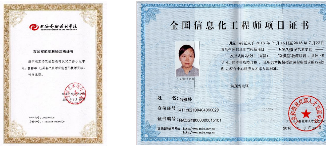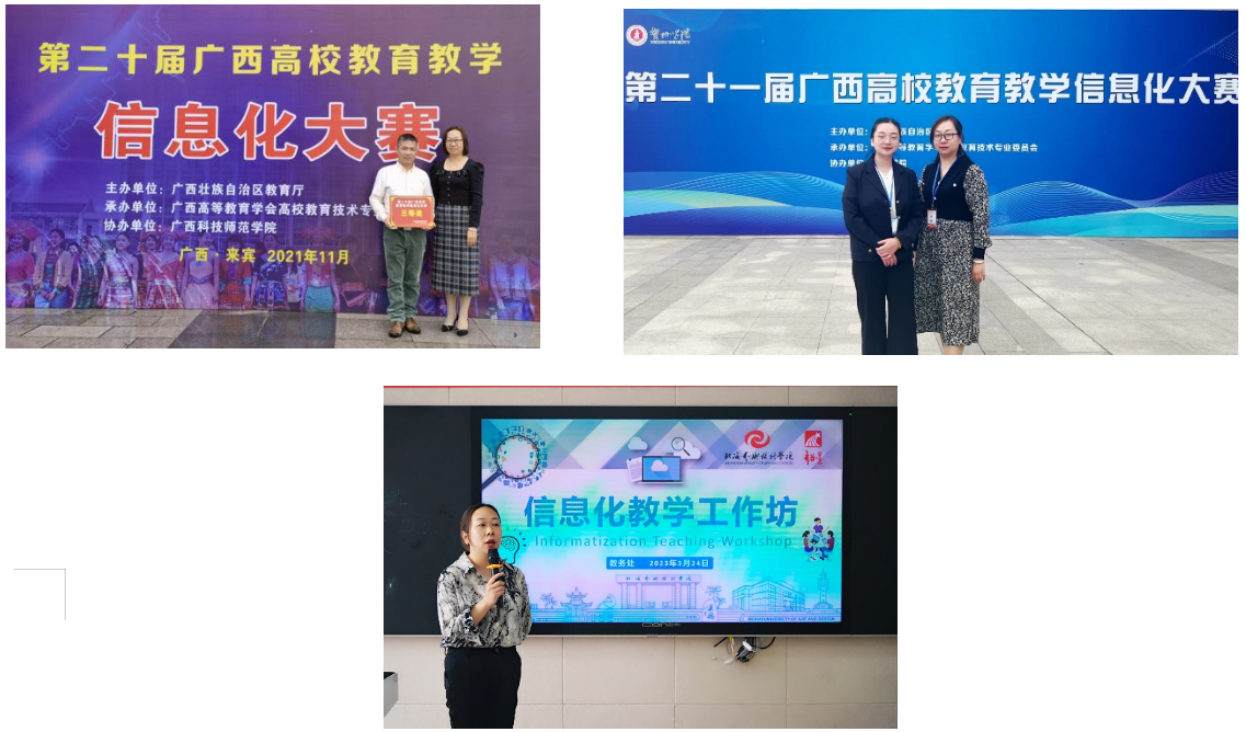 此外,吕雅婷老师还是广西高等教育学会高校教育技术专业委员会委员、广西教育教学信息化大赛评审专家。为积极推进学校信息化教学建设,组织成立了“北海艺术设计学院信息化教学工作坊”,带领老师们积极开展信息化课程建设、多次指导青年教师参加教学信息化大赛,连续多年在自治区级教育教学信息化大赛中获得可喜成绩!
