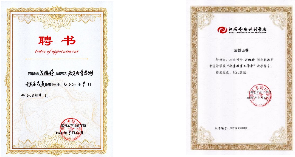 用心研究,勤于管理,作为教务处副处长,需要深入研究高等教育教学规律,关注教育资讯,及时了解国内外教育教学改革动态。吕雅婷老师时刻牢记为党育人、为国育才的使命,兢兢业业做好教务服务工作,如:组织申报和管理教学改革研究课题;引导和培育教学成果奖等。同时,兼任学校教学指导委员会秘书长,组织了各类教学相关评审会议;还以学校教学质量监测专家库成员身份,参与了学校教学质量保障体系构建。为教育教学高质量发展做出的这些努力,受到了学校全体同仁的一致认同,于2022年被评为北海艺术设计学院“优秀教育工作者”。