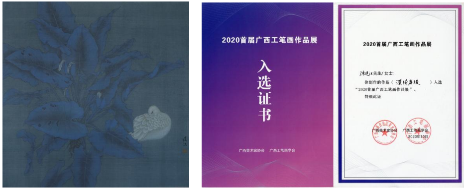 笃志科研,潜心创作。创作之路,艰辛而寂寥,需要反复实践,逐渐积累。作为青年教师,陈建江老师毫无疑问是一名勤劳的“艺海探索者”。他于2016年,即获得了中国美术家协会会员。这得益于他多年的努力积淀和参展、获奖的阅历,在广西艺术学院求学期间,已多次参加全国性展览并获奖。2015年入职北海艺术设计学院,一直从事美术基础和国画专业课程教学。繁忙的教学工作和成家立业后的生活琐碎并没有影响他艺术创作的步伐,近几年不乏有佳作诞生,如:2020年,参加中国美术家协会举办的“2020厦门(小幅)工笔画作品展”入选的作品《青暝·夕》;2022年入选“2022第二届广西工笔画大展”的作品《一岁一枯荣》;2015年,入选全国中国画作品展,并被评为“优秀作品”的作品《悲鸿精神》等。2015年至今,各级各类展览入选、获奖等,共计12项。