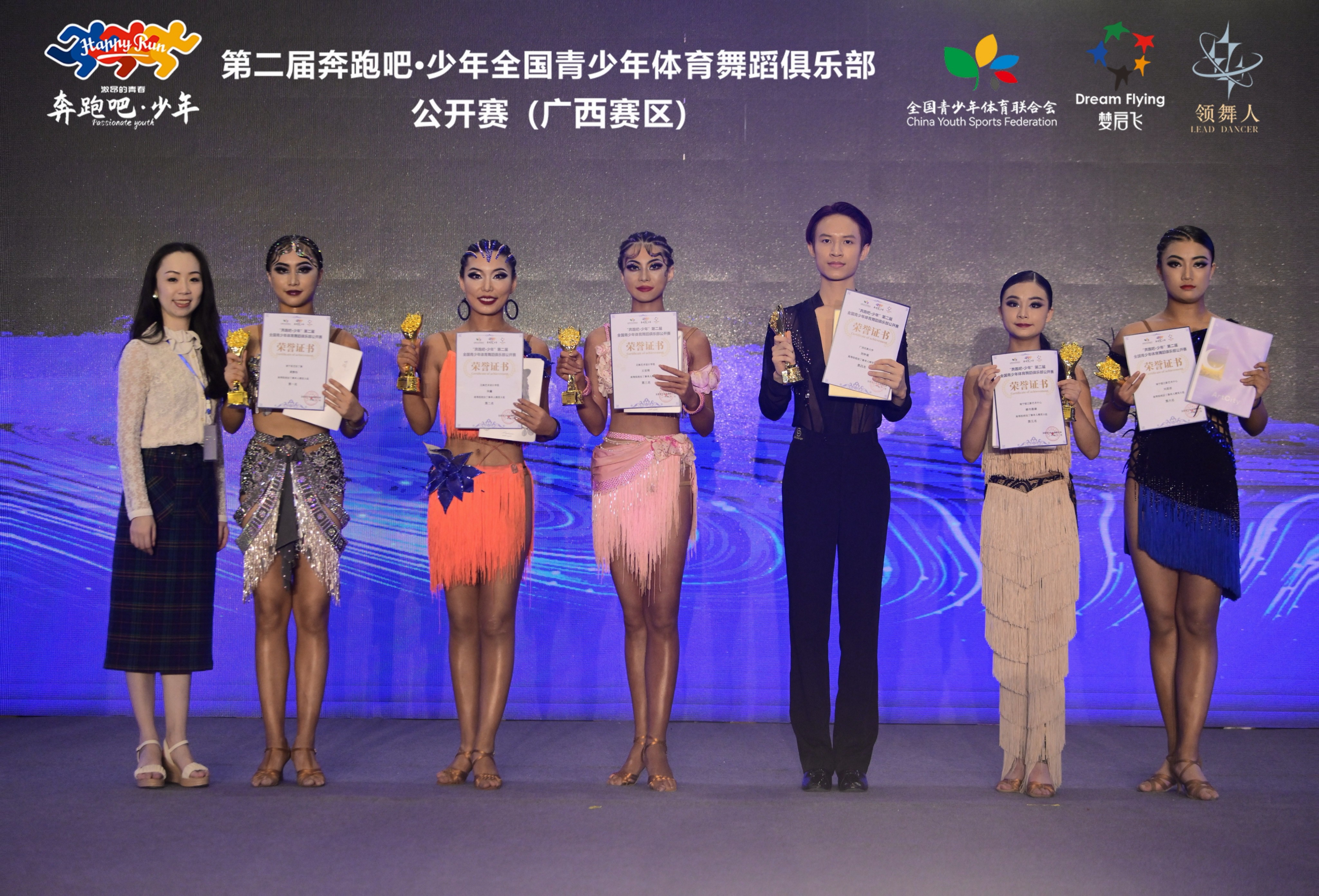 2024年5月4日,由全国青少年体育联合会举办的“奔跑吧·少年”第二届全国青少年体育舞蹈俱乐部公开赛,在广西南宁拉开帷幕。此次比赛是全国青少年体育联合会计划省级赛事的第二场,8月份将在湖南进行决赛。由我校人文教育学院舞蹈表演专业学生王安琦、动画传媒学院播音专业学生闵鑫、青年教师及本次大赛特邀评审周琦涵老师组成的代表队赴南宁参赛。经过激烈角逐,取得了高等院校单人B组第一名、高等院校单人C组第二名、高等院校精英B组第二名和第三名等多项骄人战绩。这是继2023年“劲舞红城 动感百色”全国⻘少年体育舞蹈节和CDMC 2023中国关工委体育舞蹈城市公开赛后,我校在同类赛事上再获佳绩。