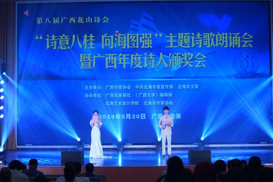 5月20日晚,由广西作家协会、市委宣传部、市文联主办的第八届广西花山诗会“诗意八桂 向海图强”主题诗歌朗诵会暨广西年度诗人颁奖会在我校举行。