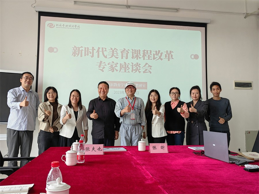 为了深入贯彻中共中央办公厅、国务院办公厅《关于全面加强和改进新时代学校美育工作的意见》,教育部《高等学校公共艺术课程指导纲要》,进一步完善我校美育课程体系建设,丰富美育课程内容,近日,通识教育学院美育教研室在图书馆508会议室召开新时代美育课程改革专家座谈会。清华大学美术学院教授、博士研究生导师、设计艺术学院名誉院长张夫也教授,湖北美术学院教授、硕士研究生导师、设计艺术学院外聘教授张昕教授莅临讲座指导。美育教研室全体教师参加座谈会。座谈会由我校“大美育”教学团队带头人刘静静老师主持。