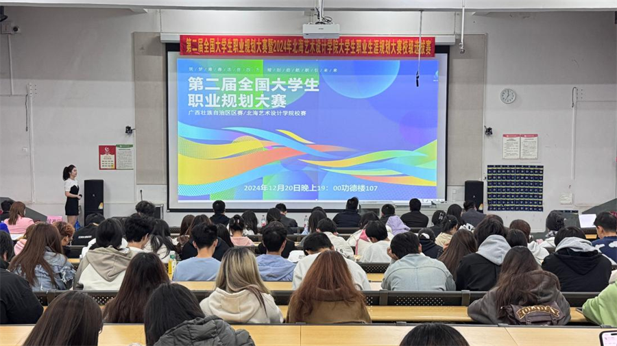 为全面贯彻党的二十届三中全会精神和全国教育大会精神,加强高校生涯教育和就业指导,增强大学生职业规划意识,指导其及早做好就业准备,以择业新观念打开就业新天地,促进高质量充分就业,12月20日,第二届全国大学生职业规划大赛北海艺术设计学院校赛在西校区公德楼107教室顺利举行。大赛由副校长邱杰、何煜,团委书记唐良春,教务处处长武鹏程,招生就业处处长邓勇担任评委,吸引学生代表近400人现场观摩。